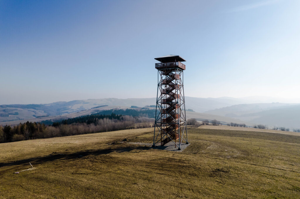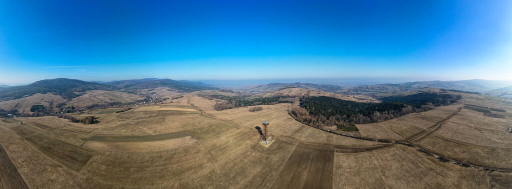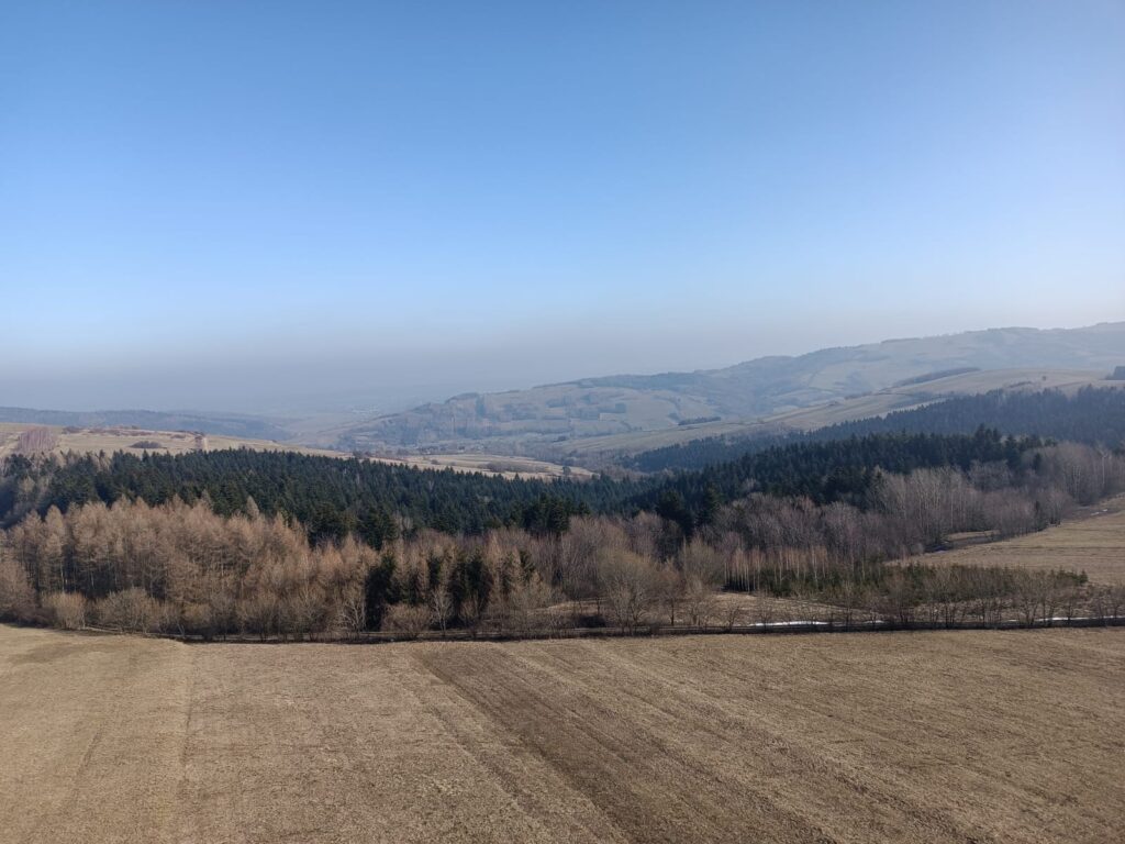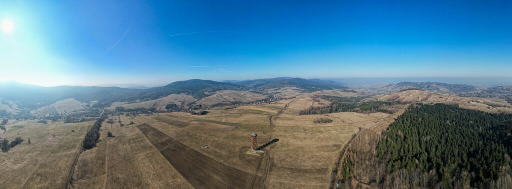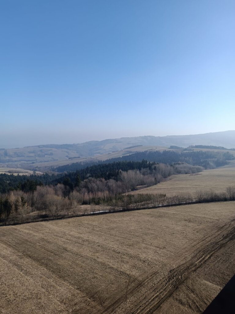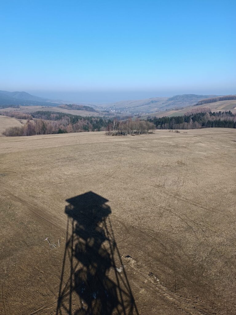 Przeglądając lokalne wiadomości wpadłem na newsa o otwarciu wieży widokowej w Desznicy (wieś w powiecie jasielskim, położona na terenie Magurskiego Parku Narodowego). Pogoda zapowiadała dobrą widoczność więc wybraliśmy się z samego rana aby odwiedzić nowy obiekt. Dojeżdżając do samej miejscowości w której stoi wieża nie napotykamy żadnego kierunkowskazu, który nas chociaż trochę pokieruje do celu. Dopiero mieszkaniec wioski wskazał drogę na parking, z którego około 10-15 min spacerku i już jesteśmy na wieży. Obiekt wybudowano w szczerym polu co zdecydowanie zwiększa zasięg obserwacji stojąc już pod nim samym, wspinając się coraz wyżej po metalowo-drewnianej konstrukcji krajobraz odkrywa więcej obrazków. Niestety mimo bezchmurnego nieba, widoczność była kiepska, nie sięgnęliśmy wzrokiem najbardziej odległych terenów, ale na pewno wrócimy tu na wiosnę.